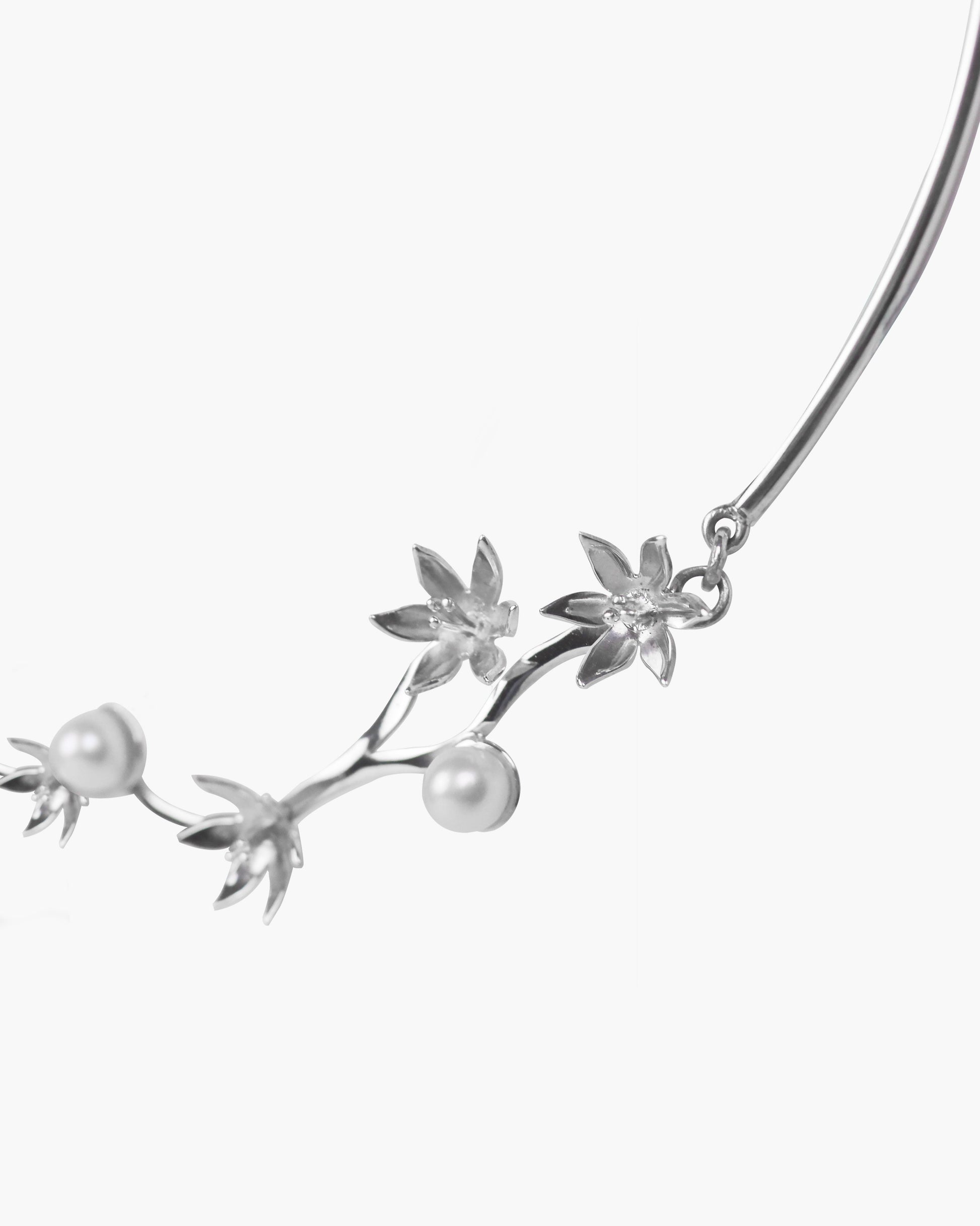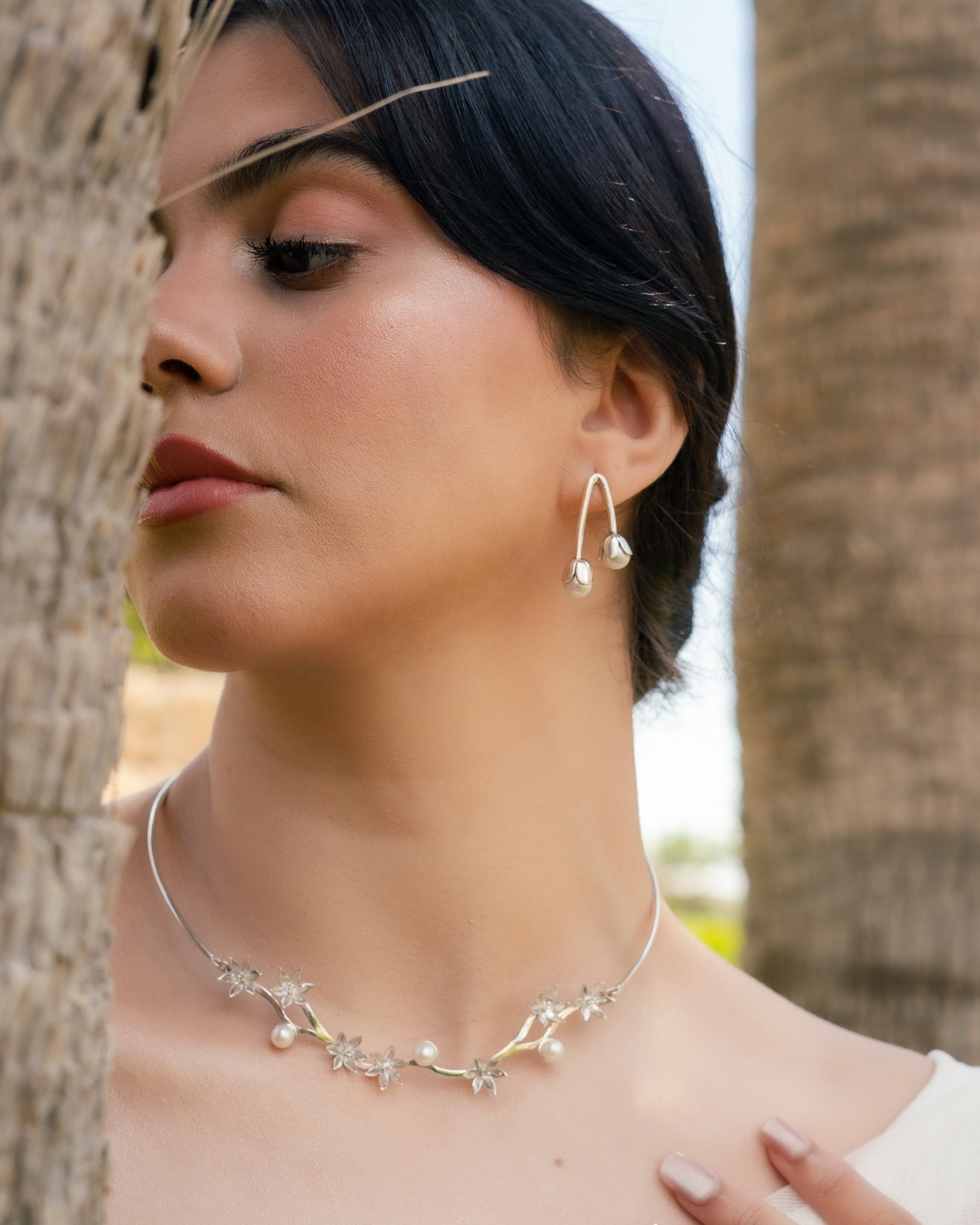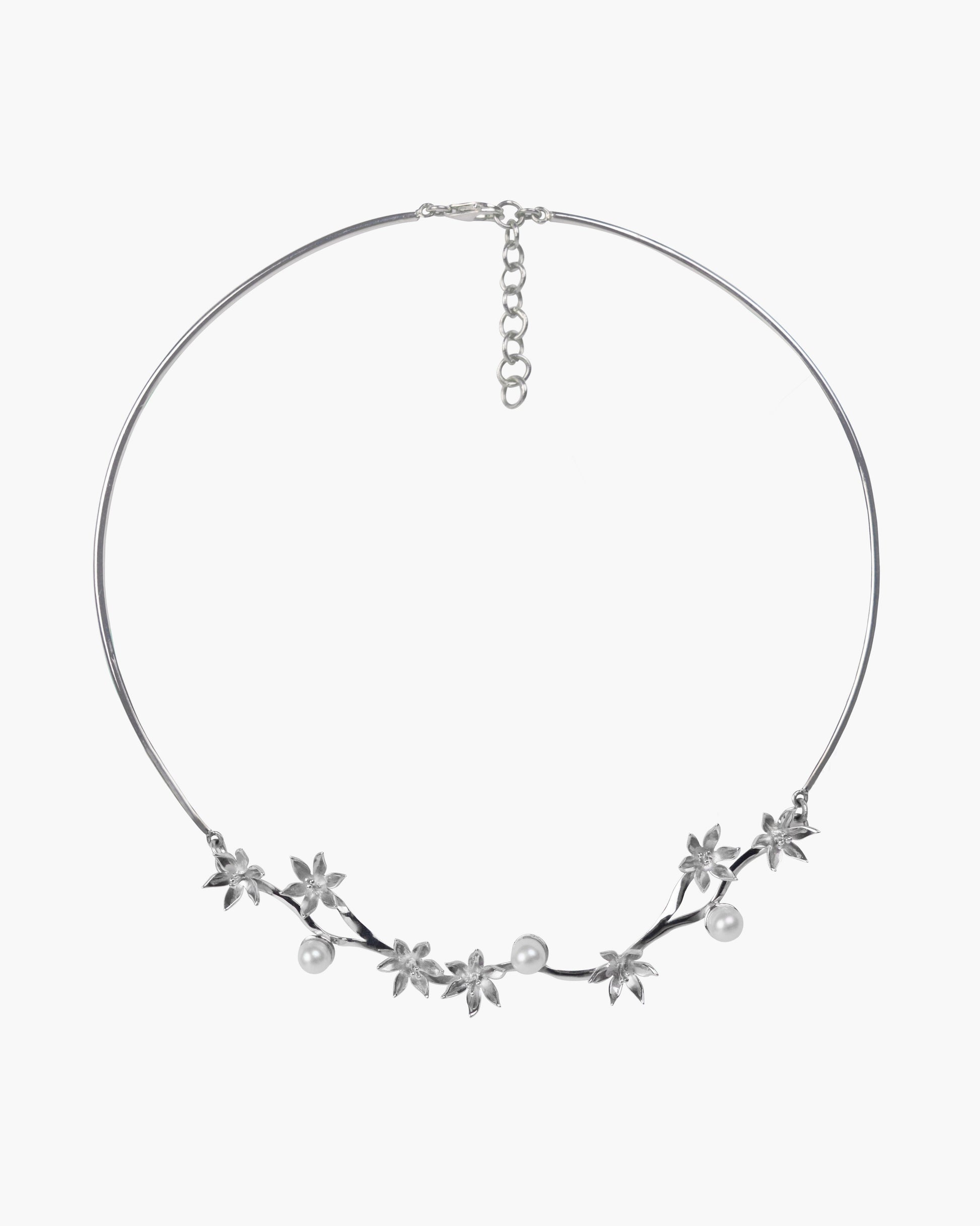 A delicate sterling silver choker adorned with lily-inspired blossoms and freshwater pearls. Designed to sit softly on the collarbone, this piece blends organic lines with understated elegance, perfect for bridal moments or special occasions.