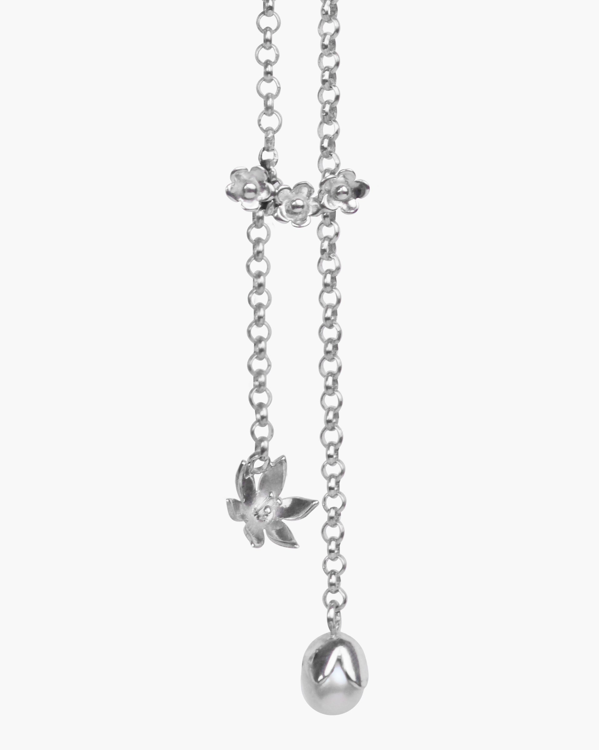 A modern classic chain necklace, versatile in length to suit many styles and looks. One side is a blossoming lily flower and the other side is a bell-shaped floral form accented with a freshwater pearl. It all comes together with three beautiful silver flower blossoms.